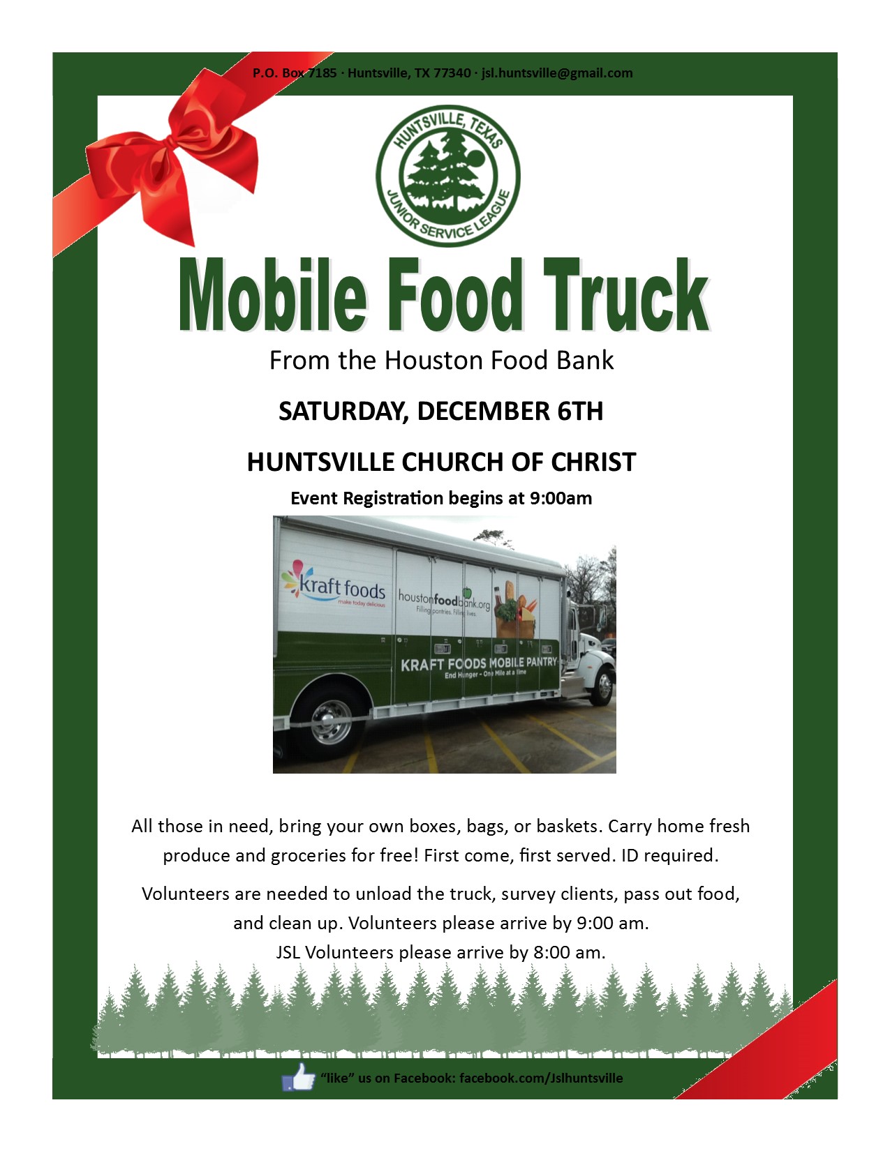The Mobile Food Truck from the Houston Food Bank will be in town this Saturday, December 6! Kick off the holiday season by serving those in our community who are less fortunate.