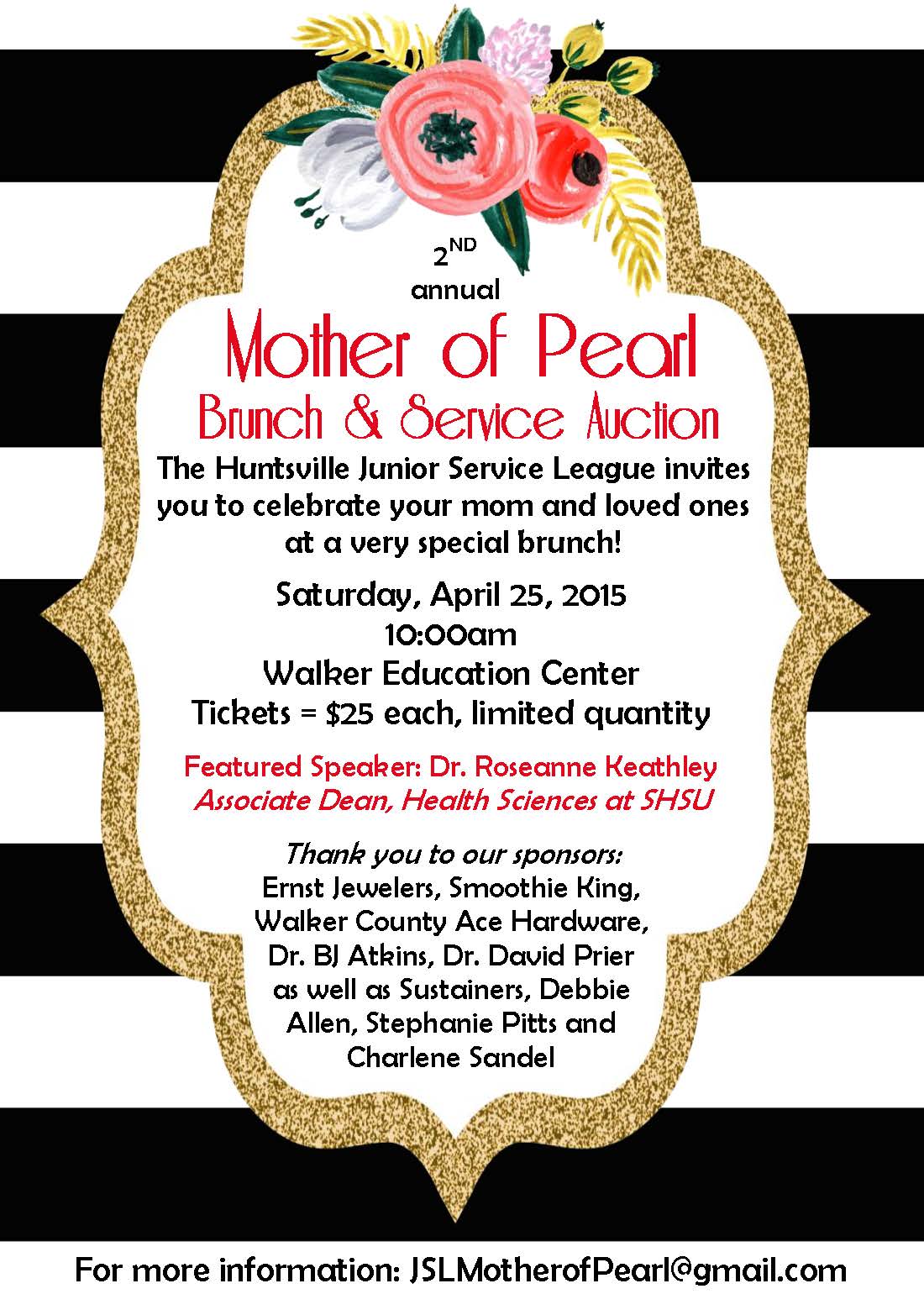 Join us for a wonderful brunch celebrating mothers, daughters and all the special ladies in your life. The Second Annual Mother of Pearl event is Saturday, April 25 at 10:00am at the Walker Education Center. A silent auction consisting of unique service items will precede brunch. We are honored to have Dr. Roseanne Keathley, Associate Dean of Health Sciences at SHSU as our featured speaker. You do not want to miss this lovely event!