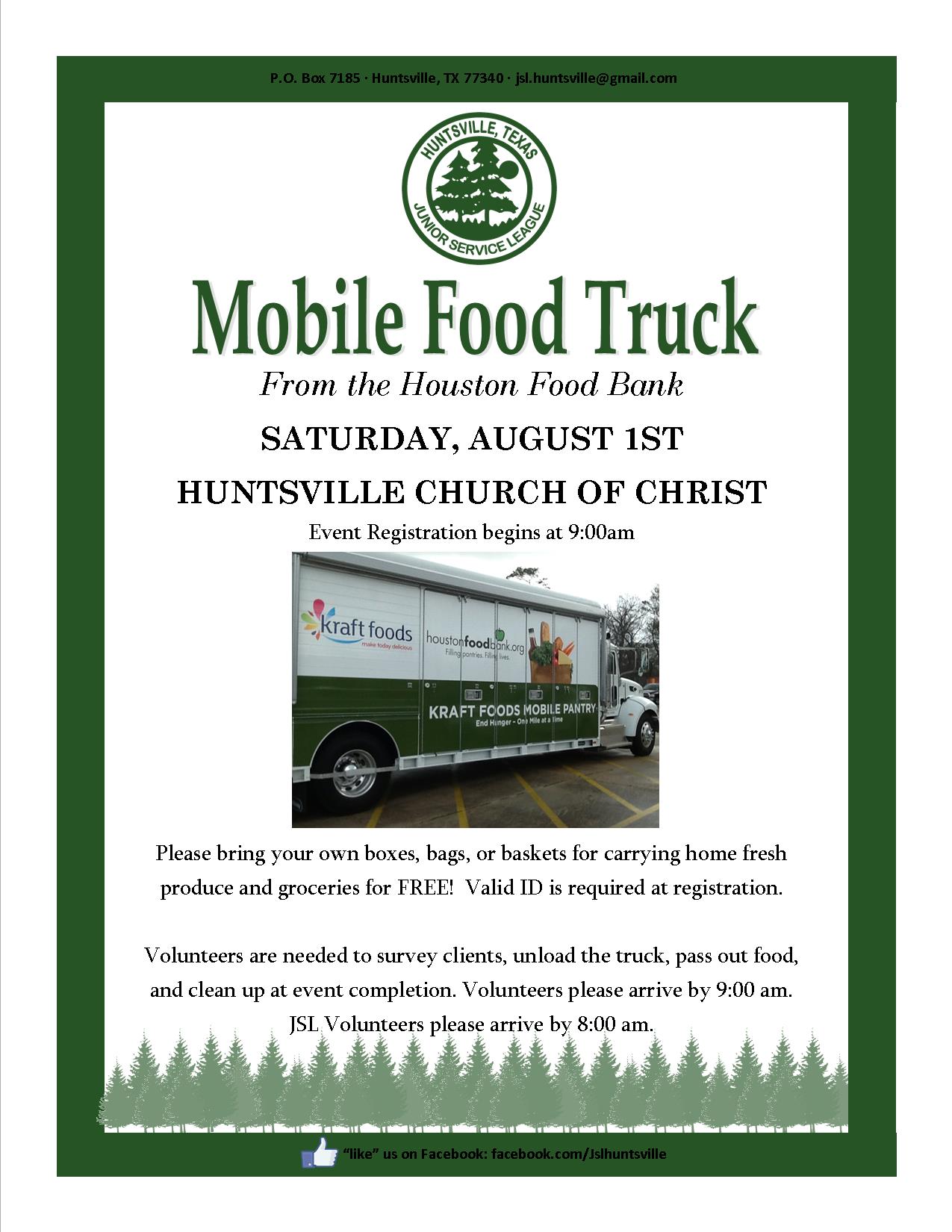We are super excited to announce that the Mobile Food Truck from the Houston Food Bank is returning to town on Saturday, August 1st! The Huntsville Junior Service League is teaming up with the Huntsville Church of Christ to bring much needed items to help start a new school year off on the right foot! HCOC is having their annual Back-to-School clothing give away and in conjunction, the food truck will be bringing fresh produce to distribute to all who attend.