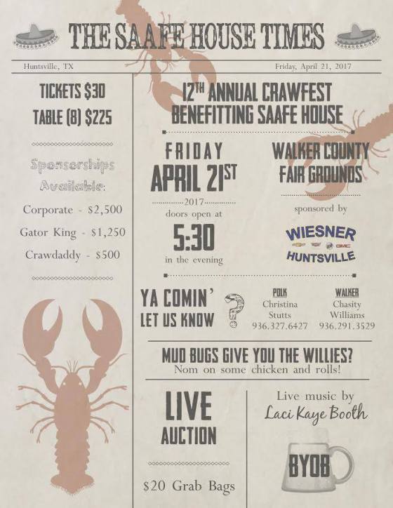 Mark your calendars and call for more information! To find out more information about the SAAFE House Crawfest, follow this link… https://www.facebook.com/saafehousecrawfest/.