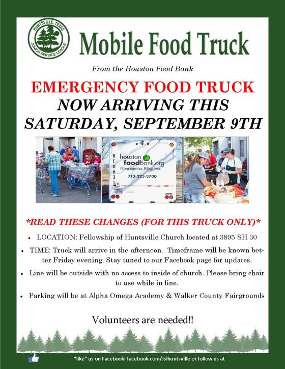 GREAT NEWS!! Due to emergency aid conditions in Texas, the Houston Food Bank is now available to come to town THIS SATURDAY!