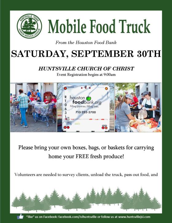The Mobile Food Truck from the Houston Food Bank is returning to town in one week!! The food truck will be stocked with fresh produce to distribute to all who attend.