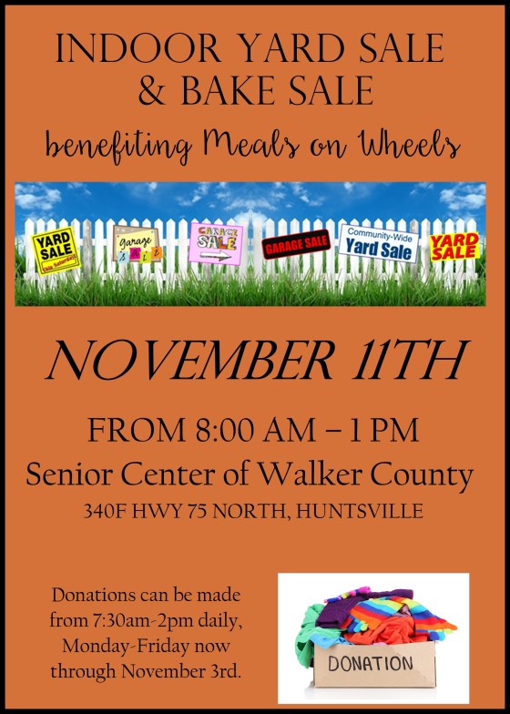 The Senior Center of Walker County delivers hot meals every week day to homebound seniors in our area. The Meals on Wheels program delivered approximately 31,000 meals last year!! Feeding this many people every year requires the support of the community and a good bit of fundraising. The center has a huge indoor yard sale planned for Saturday, November 11th.