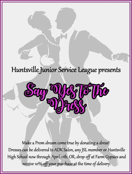 If you have dresses you want to donate now, contact any member of the JSL or drop off at Huntsville High School. Salon ADK at 1526 Sam Houston Avenue is accepting donations and the sweet ladies at Farm Gypsies are offering 10% off your entire purchase when you drop off a dress at their shop!