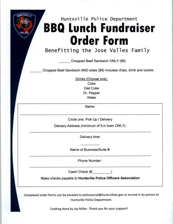 Huntsville Police Officer, Sergeant Jose Valles, a 25 year veteran of the force was diagnosed with cancer earlier this year. The Huntsville Police Department is hosting a BBQ Lunch Fundraiser to assist with medical costs during his time of need. The BBQ lunch will take place on Friday, April 6th at the Police Department at 1220 11th Street in Huntsville. Jay Miller will be the grillmaster for the event!