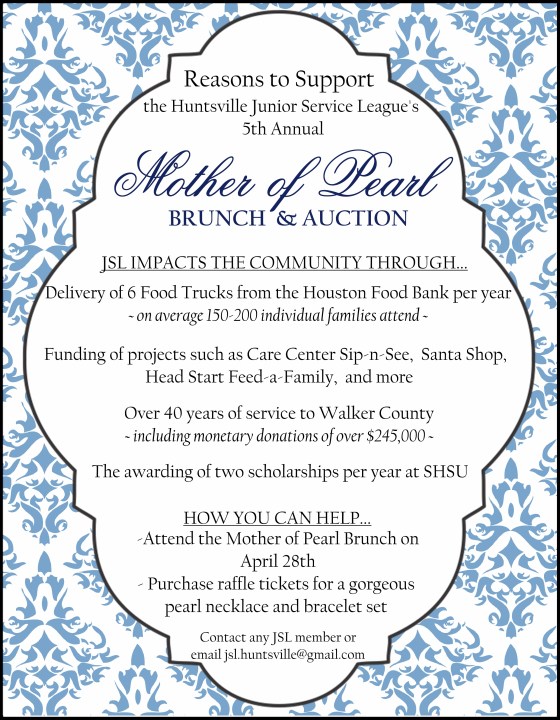 You can help us continue projects such as the Mobile Food Truck, Head Start Feed-a-Family, Care Center Sip-n-See, Santa Shop, Special Kids Rodeo, and more. Please consider joining us at our April 28th Mother of Pearl Brunch. It is truly a special event for ladies and we’d love to see you there! Tickets are $25 and are on sale through midnight this Sunday.