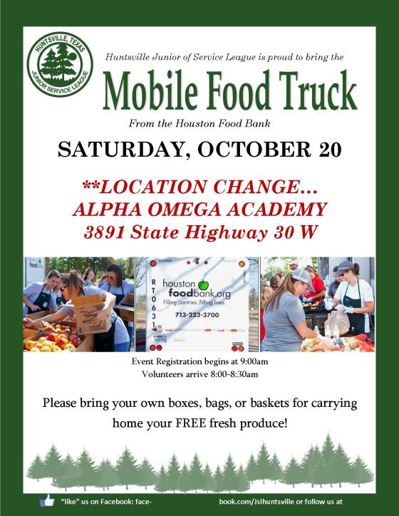LOCATION CHANGE! Due to a funeral at Huntsville Church of Christ, the food truck will be coming to ALPHA OMEGA ACADEMY located at 3891 SH 30, Huntsville. The school is located between the normal church location and the Walker County Fairgrounds.