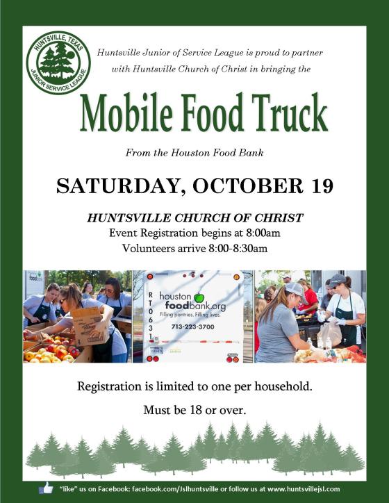 The food truck is one of our most impactful projects and it would not be possible without the support of our community through helping us raise funds with our fall and spring fundraisers, volunteering alongside us and sharing important posts. Thank you to all who make it possible for us to bring the food truck from the Houston Food Bank to Huntsville!