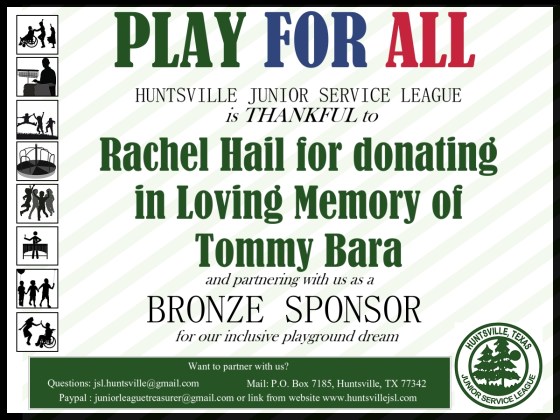 If you’d like to join Rachel in making an inclusive playground for kids of all ages and abilities, we’d be happy to take your donation of any size! Links to Go Fund Me and Paypal can be found HERE. Checks can be mailed to P.O. Box 7185, Huntsville, TX 77342. Donations of over $1000 will be considered sponsorships and the donor will be recognized on the signage installed at the park.