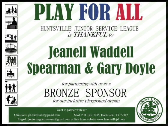 Jeanell Waddell Spearman was excited to hear of the efforts to build an inclusive playground in Huntsville, Texas! She and her husband, Gary were inspired by the plans and happy to join JSL as a Bronze sponsor to help us achieve raising the necessary funds.