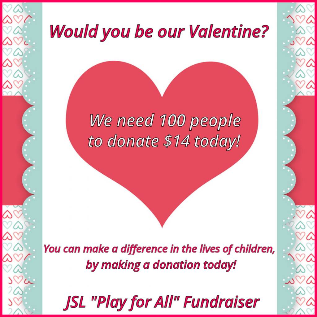 Would you be our Valentine? Our goal is to have 100 people donate $14 today in the spirit of February 14th~Valentines Day towards our all inclusive playground project!