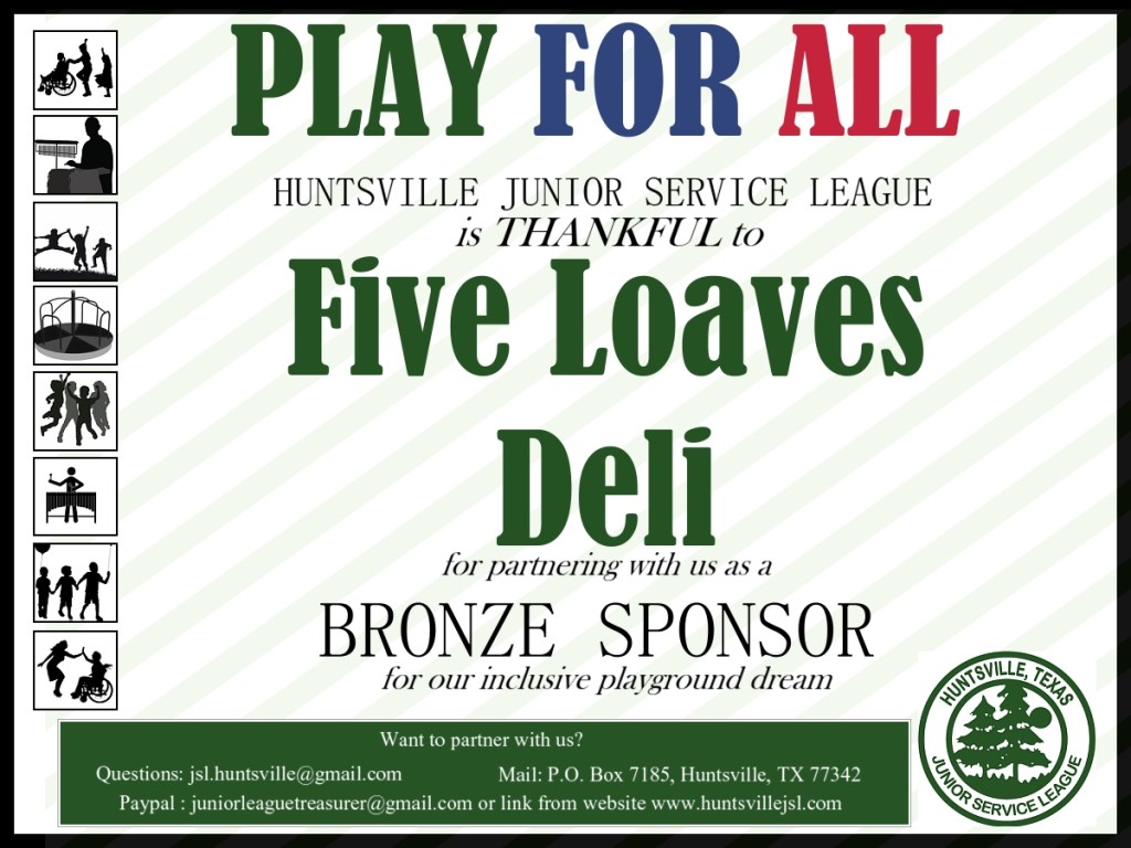 If you would like to join Five Loaves Deli in making our PLAY FOR ALL playground dream come true, please visit our website for more details on how you can help! https://huntsvillejsl.com/play-for-all-an-inclusive-dream/