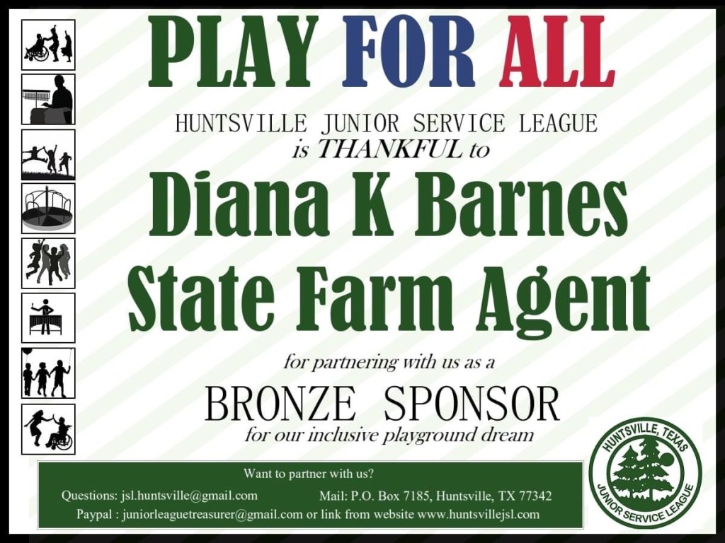 Thank you to Diana K Barnes – State Farm Insurance Agent for becoming a sponsor of our PLAY FOR ALL inclusive playground project! The $1000 Bronze Sponsorship becomes $2000 due to State Farm’s donor matching program! Double the cheers!! We are so very grateful for your support!